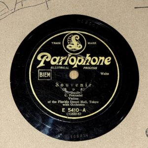 Voici une acquisition récente – un joli disque japonais de Parlophone avec un solo de violon intitulé « Souvenir » de Charles Paknadel, violoniste (et cornétiste) qui travaillait comme l’un des musiciens primaires du Moulin Rouge Jazz Band au Florida Dance Hall, Tokyo, Japon. Enregistré en c. Novembre 1931 et publié en février 1932.